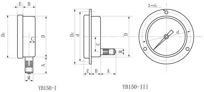 YB-150A型在标度线下设有镜面环,使仪表读数更清晰,外形美观新颖。度为0.5、0.4、0.25级。